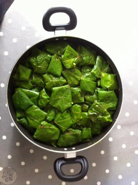 Wrap a good spoonful of the mixture in the vine leaves and place in a non-stick pan.